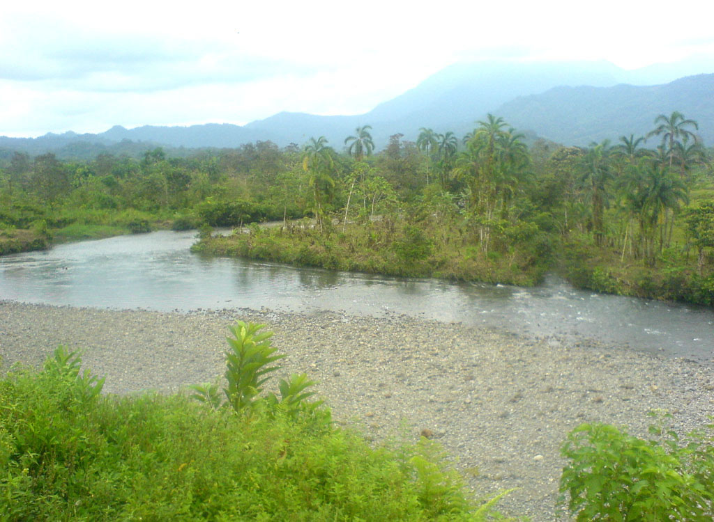 Columbia/colombia150Previous | Home | NextFurther upstream, on a quebrada (fork) of Rio Condoto. The gravels in the foreground show the promising placers that the original explorers worked to obtain gold. In these gravels one could pick out individual grains of gold, either by hand or by panning techniques. In Rio de San Juan tributaries white grains were also found, which were the "platina." These rendered the gold brittle when alloyed and were deemed worthless, and were dumped as waste into the river by order of the Crown. Courtesy, Christian Castro. |