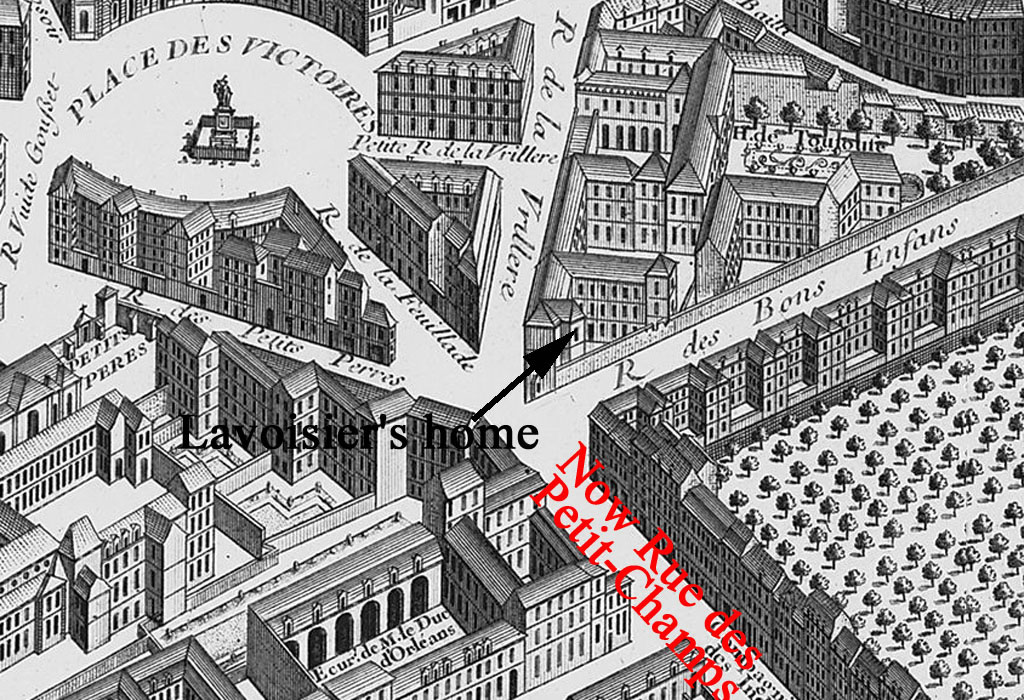 Paris, France Folder C/parisC015Previous | Home | NextThe Place des Victoires still exists, but the west-east street leading into it is now called Rue des Petit-Champs. The street (Rue Nueve des Bons Enfants) no longer exists but has been renovated for the Banque de France (Bank of France), although a short side street Rue Radziwill exists in its stead. The branching streets Rue de Petit-Pères and Rue la Vrillère still exist. |