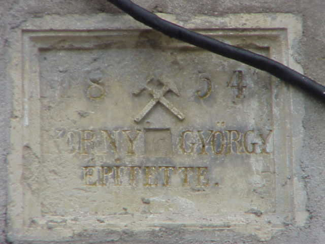 The inscription reads "1854 Kornyik György építtete" – translated as "In 1854 George Kornyik [had this house] built."