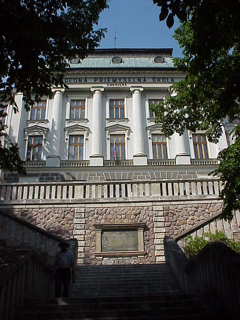 Through the gates, the main building commands an imposing presence at the top of a hill. At the top of the stairs is a plaque.