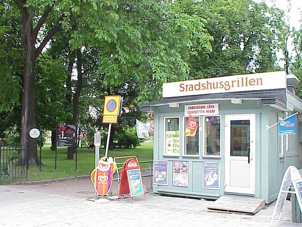 Across the street (Hantverkargatan) from Stadshuset is the "City Hall Grill." Behind to grill, to the left, is the Serafimer Hospital area. View is northwest.