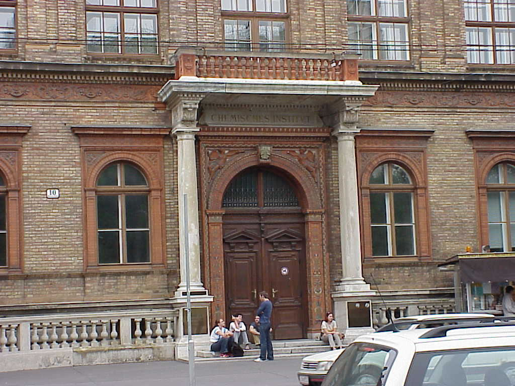The entrance of the old chemistry building. The present use is identified by the plaque at the bottom of the pillar (see next photo).