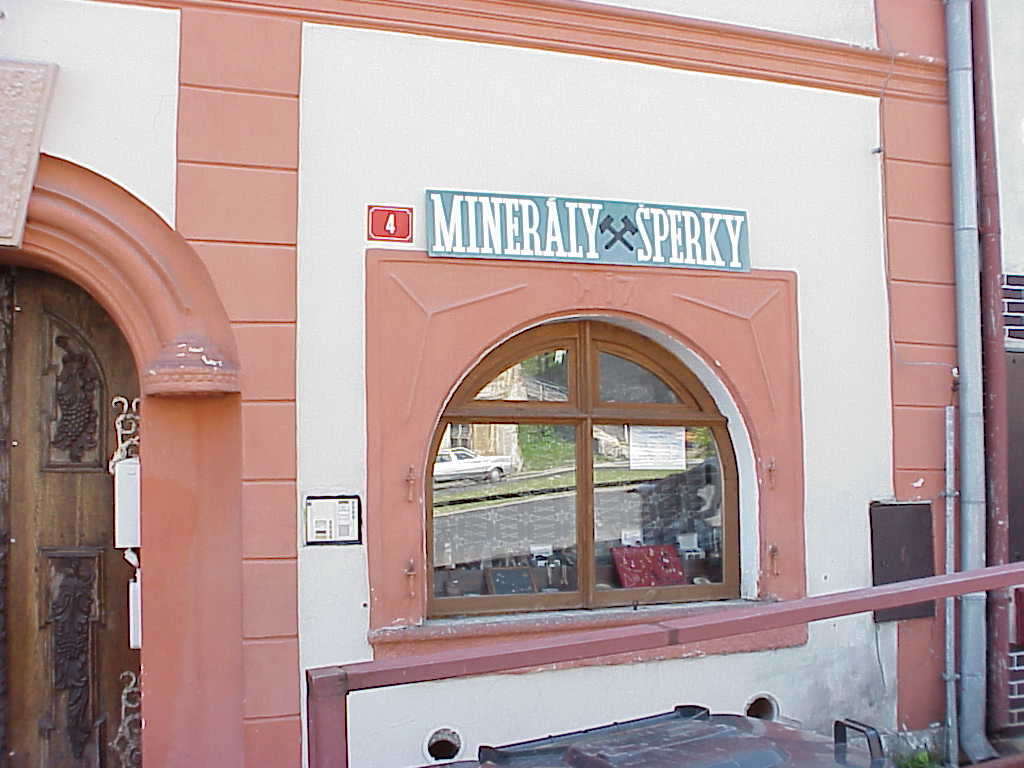 "Minerály - Šperky" is Czech for "Minerals - Jewelry." Inside the shop authentic samples of pitchblende (