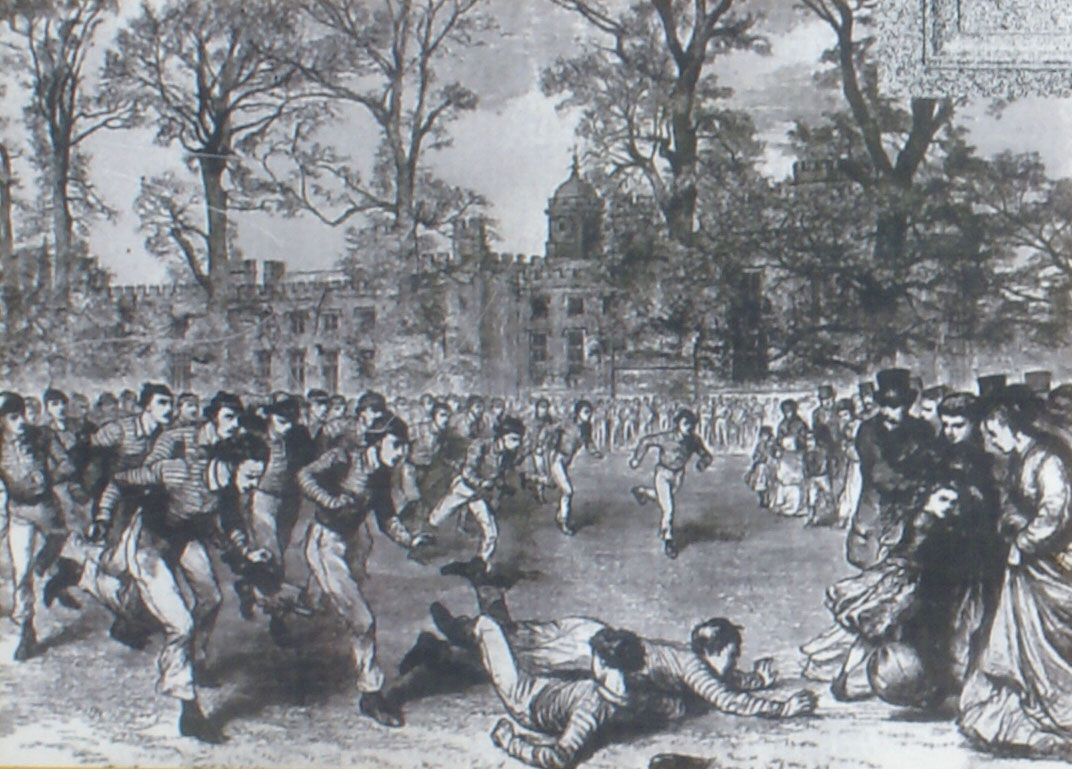 Daventry, England/daventry703Previous | Home | NextA rugby game in 1870. In the mid-nineteenth century William Gilbert, bootmaker of High Street, made footballs for the boys of Rugby School. The ball was originally large and round, its shape determined by the inflated pig's bladder inside, and was covered by four pieces of leather. By the mid-1900s the oval shape -- easier to pass and carry -- had become the norm. |