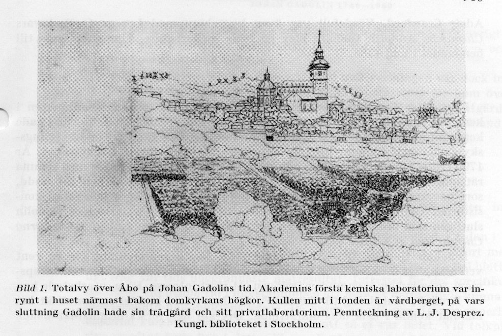 Turku, Finland/406Previous | Home | NextThis is a drawing of Turku from a point northeast of the university. Translation of inscription (from Swedish): "General view over Åbo at Johan Gadolin's time. The first chemical laboratory of the Academy was comprised in the house nearest behind the cathedral chancel. The hill in the middle of the background is Vårdberget, on which's slope Gadolin had his garden and private laboratory. Pencil drawing by L. J. Desprez. The Royal library in Stockholm." The location of the artist is perhaps a little north of the modern Chemistry Building ("Gadolinia"). The chemical laboratory itself cannot be discerned in this drawing, but would be behind the polygonal dome to the left of the cathedral spire. Drawing, courtesy Pekka Pyykkö. |