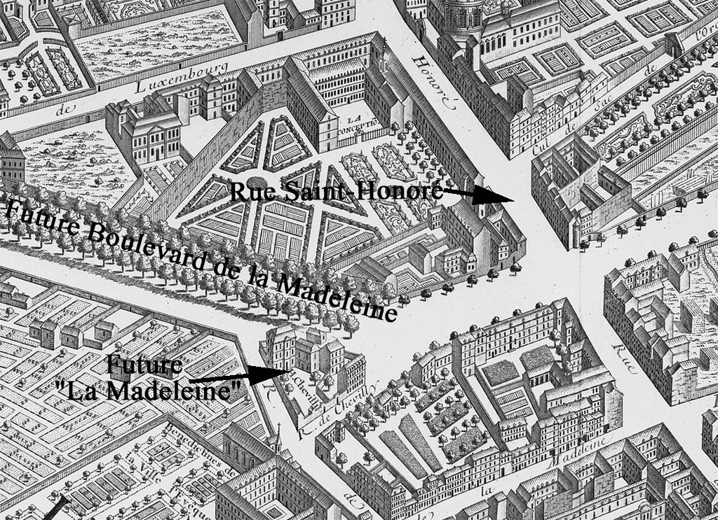 Paris, France Folder C/parisC204Previous | Home | NextThe Boulevard de la Madeleine wasn't even officially named yet; its name wasn't given and the street wasn't officially opened until 1792, the same year Lavoisier moved into his new (and final) home. The well known Place de la Madeleine (see below) in 1739 (date of the Turgot Plan) was a mansion complex on a small plot of land; a building here through the years had served as a church and an oratory. The building shown in this Turgot Plan, the Hotel de Chevilly, dated from 1728. The construction of the present Église de la Madeleine has a long history, having been started in 1763 and finalized only in 1842. |