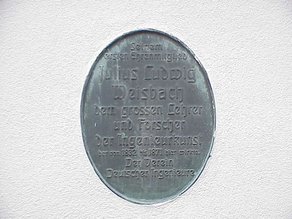 A third plaque, "The first honored member, Julius Ludwig Weisbach, the famous engineering teacher and researcher, who worked here 1832-1871; Society of German Engineers." Weisbach wrote treatises on mining mechanical engineering.