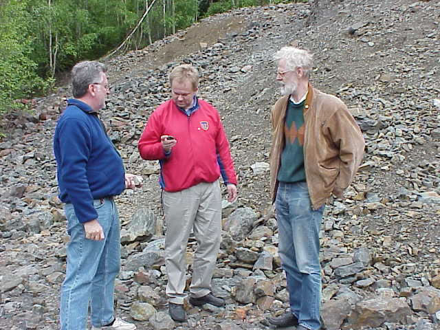 Riddarhyttan, Sweden030Previous | Home | NextOn the right is Bengt Högrelius, a local guide and expert on mineral of the Bastnäs region; in the middle is his son, Anders, who is also a prosperous geologist. The two could sort through the talus pile and find several interesting minerals. |