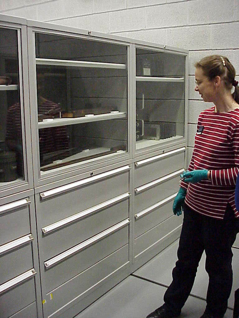 Julie Wetton, curator of the museum, shows us the Dalton cabinets.
