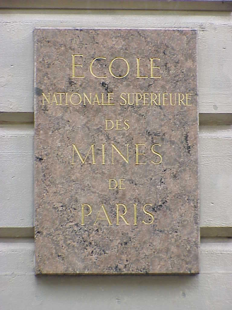 The plaque to the right of the entrance: "National Superior School of Mines of Paris," usually known simply as the "École des Mines," (School of Mines).